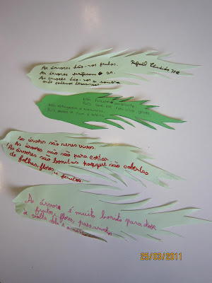 Elaboraram alguns marcadores de livros, homenagearam as árvores, escrevendo pequenas frases nas folhas verdes e ouviram poemas pelos alunos dos 6º Anos.